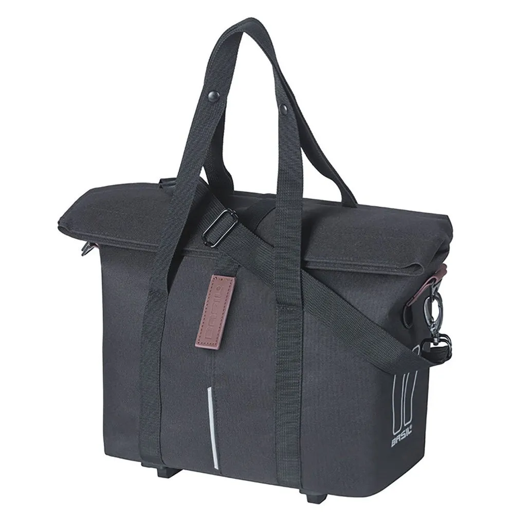 The handbag has a detachable shoulder strap, so you can easily carry it over your shoulder. Once you get on your bike, you can attach this pannier in multiple ways. Do you want to have the bag in front of you. Then attach the Basil City handbag to your handlebar with the pre-mounted Basil KF adapter plate (system sold separately). With the pre-mounted hooks, you can also hook the bag to your luggage carrier. Do you want to be able to change panniers quickly. Then you can also use the MIK system (MIK adapter plate sold separately).