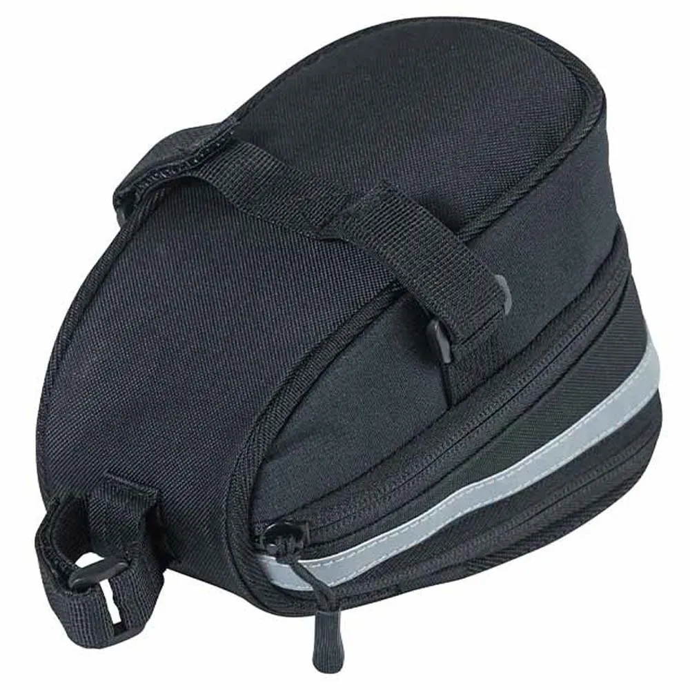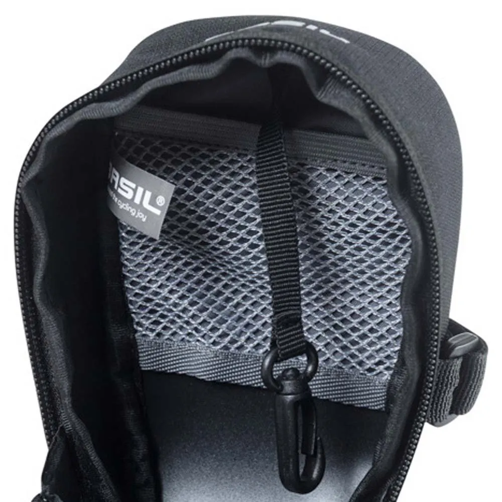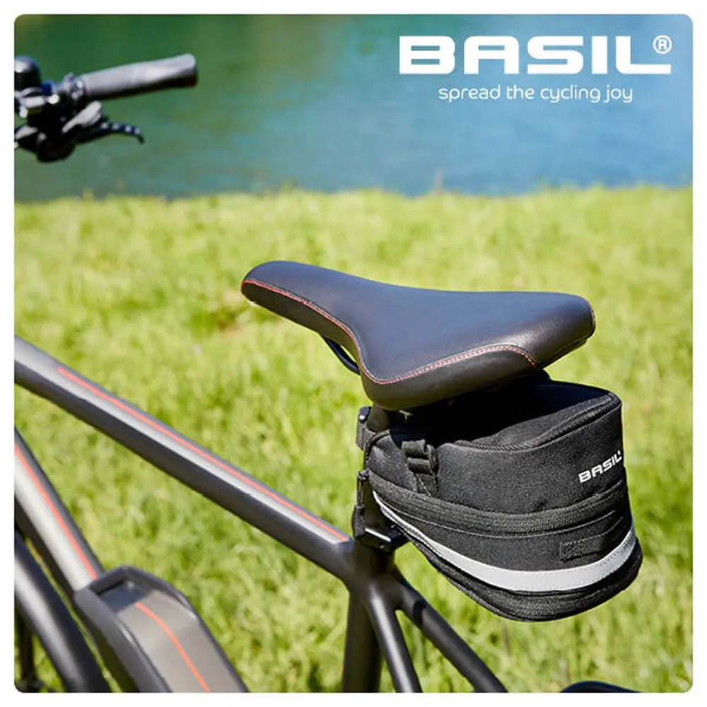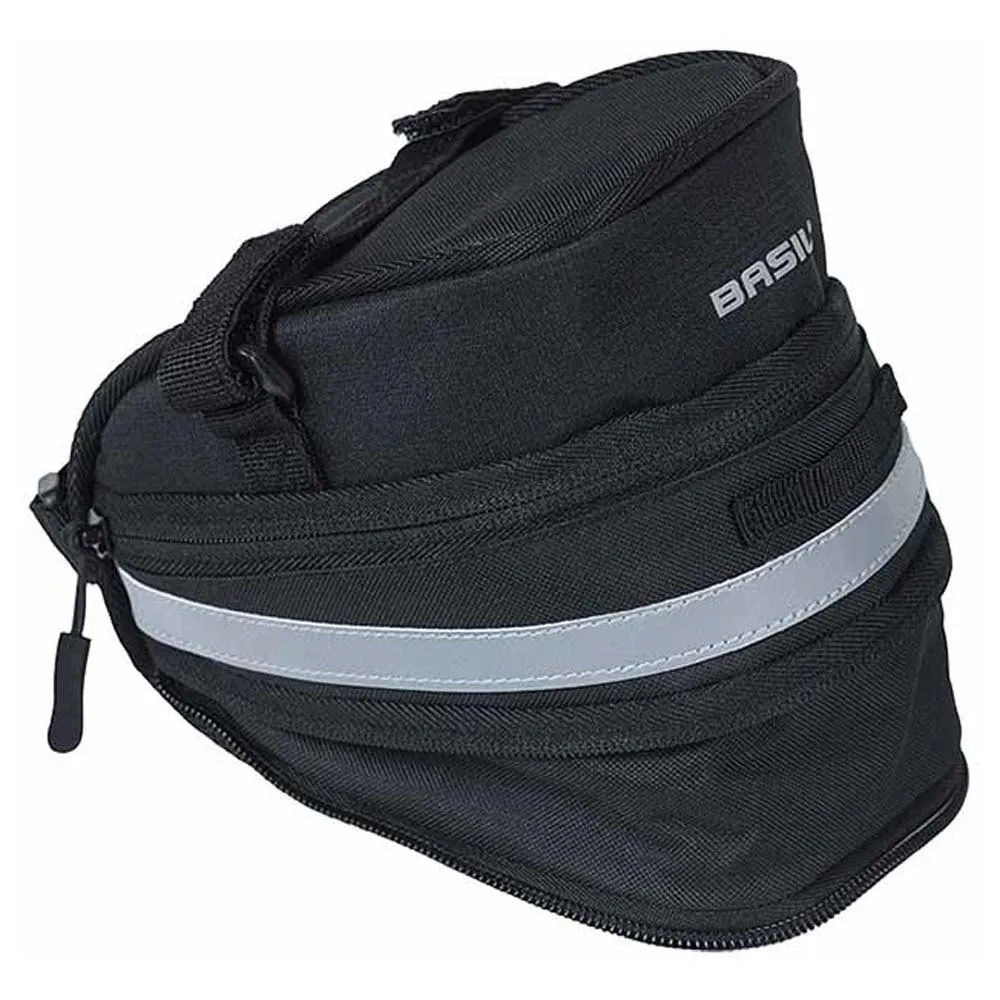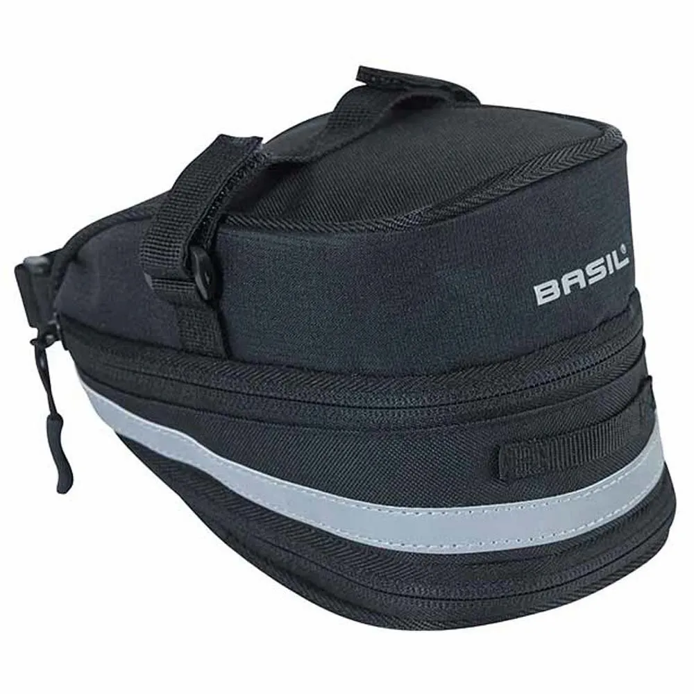 The Basil Mada Is A Compact Black Saddlebag With A Capacity Of 1 Litre. It Is Made Of Polyester And, Thanks To The Reflective Strip, Makes You Clearly Visible In The Dark. Ideal If You Are Returning From A Late Meeting. If You Regularly Get On Your Bicycle To Get To Work Or If You Just Like A Nice Bicycle Ride, Then This Handy Saddlebag Is Indispensable For Storing Small Bicycle Accessories. You Might Store A Spare Light Or Puncture Repair Items In It. The Bag Has Three Velcro Straps For Attaching To Your Bicycle Saddle – You Can Easily Do This Yourself – And There Is A Loop For A Bicycle Light. The Unique Expanding Pocket In The Saddlebag Increases The Capacity From 1 Litre To About 1.5 Litres.