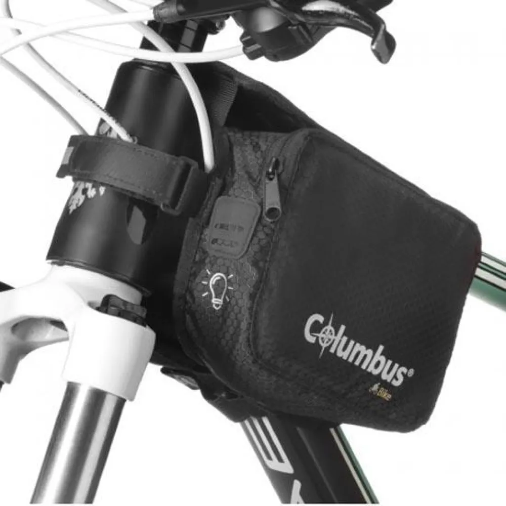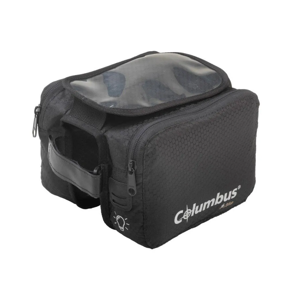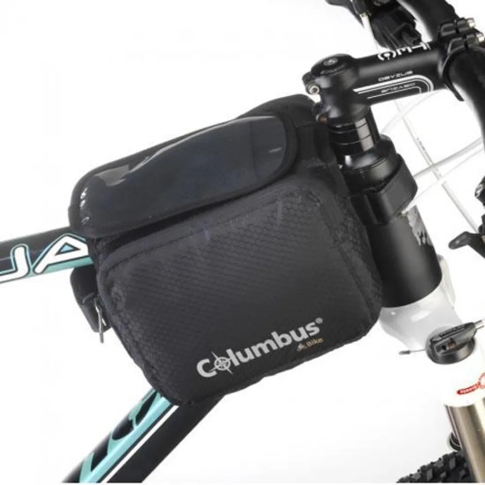 Bag for bike frame behind the stem. Light, it has two 1l.zippered front pockets and a smartphone pocket on top with touch screen window.