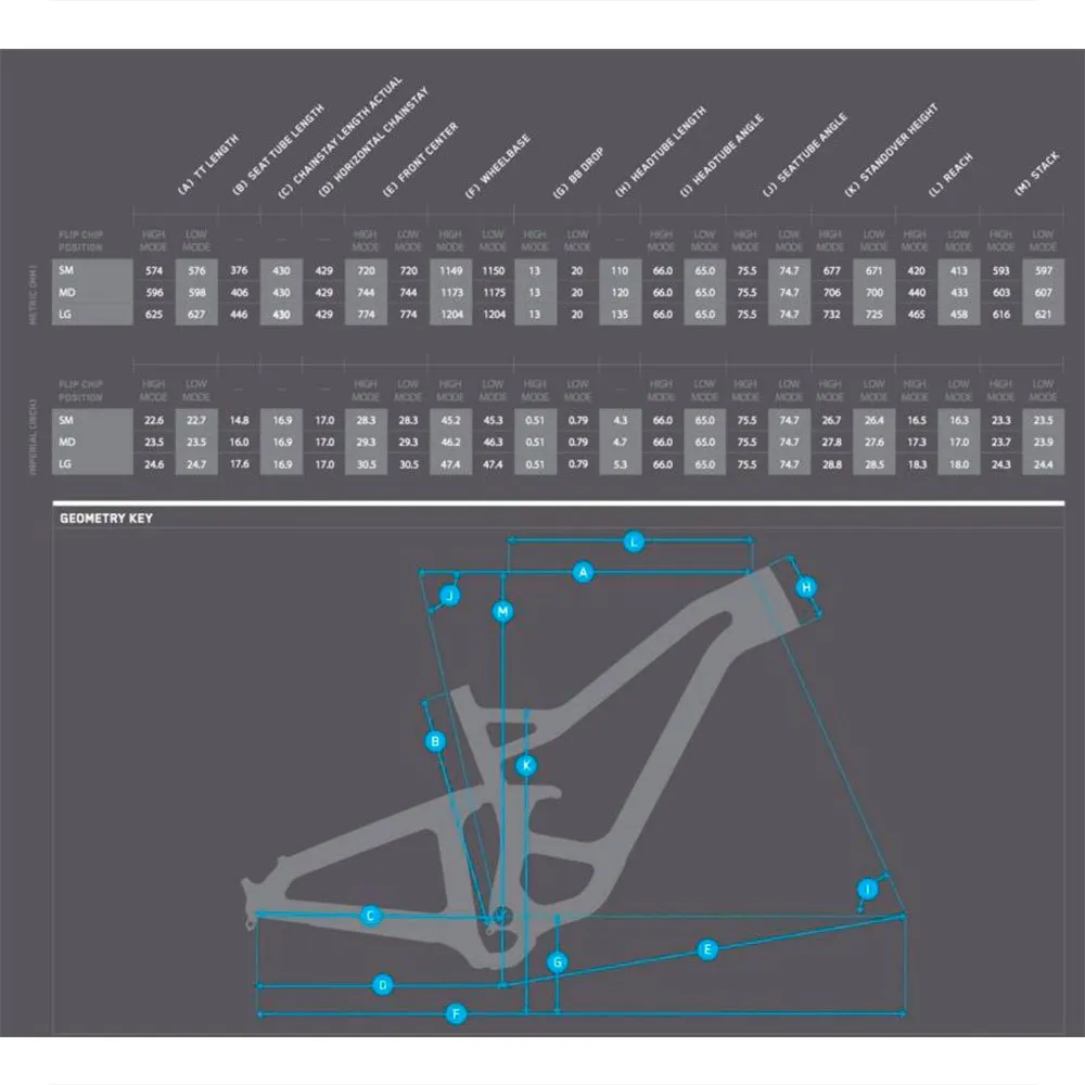 – Slack head tube angle: 66 degrees (high) / 65 degrees (low)