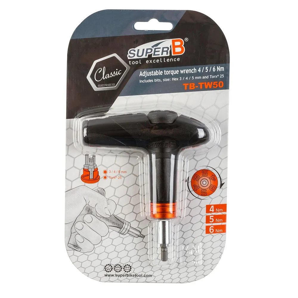 T-shape torque wrench SUPER B Classic TB-TW50, adjustable for 4/5/6 Nm, lwith bits 3/4/5 mm and T25