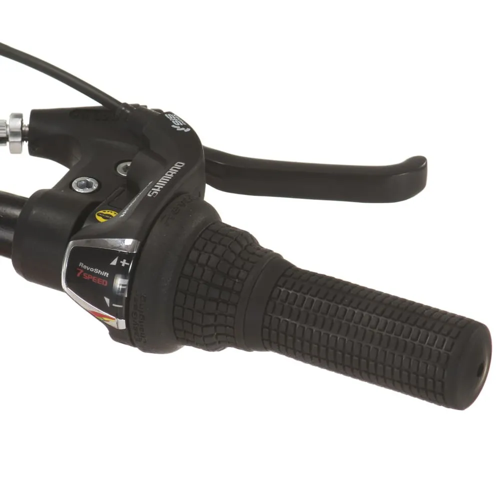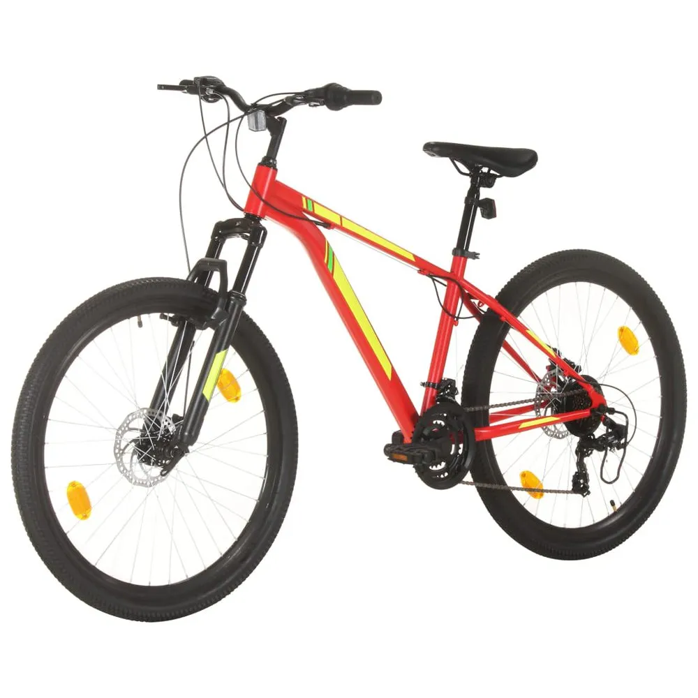 Hit your favorite trail with this mountain bike! This bike with 27,5” fat tires offers you a smooth riding experience even on rough terrain. The steel frame and suspension fork keep the ride smooth, while strong and light aluminium rims provide added stability. Motivation comes in the form of a 21-speed drivetrain featuring a Shimano front and back derailleur. Tool-free adjustable seat post makes it easy to find a comfortable fit. You can ride high or cruise down low with great ease. The disc brakes are designed for crisp all-condition stopping. Colour: Red Frame/fork material: Steel Wheel rim material: Aluminium Overall length: 185 cm Handlebar height: 100 cm Wheel diameter: 68 cm (27,5 inch) Saddle height: 95 cm Frame height: 38 cm Disc brakes Quick release seat post clamp 21-speed drive-train with Shimano derailleur Assembly required: Yes