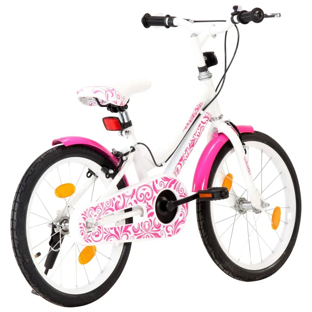 This stylish and sturdy kids´ bike with 18-inch wheels is a perfect gift for your child. Equipped with height-adjustable saddle and handle bar, the bicycle will provide years of fun. The side stand adds stability when the bike is parked. The kids´ bicycle comes with a chain guard to prevent the chain from entrapping rider´s feet and clothes. Decorated with cute prints, the bicycle will surely win your child´s heart. The kids´ bicycle has a strong frame made of MIG (metal-inert gas) welded steel. The foam-padded saddle adds to the seating comfort. In addition, the low stand-over frame allows for easy access. The bike comes in a carton. The wheels, steering wheel and saddle must be assembled to the frame. The wheels, brakes and gears must be set and fine-tuned in a way they work properly. So be well informed that the bike doesn’t come to ride away directly; assembling and fine tuning are required before you can use the bike. Note: There may be local legal requirements for lighting, reflector etc. Always follow the requirements. Otherwise do not ride the bicycle in public areas. Colour: Pink and white Frame material: MIG welded steel Rim material: Steel Saddle height (adjustable): 58 – 61,5 cm Wheel size: 18 inch (457,2 mm) Number of gears: 1 Front & rear V brakes Height-adjustable handle bar With chain guard and mudguard Front and rear reflectors Front and rear lights With side stand Multi spanner tool provided User body length: 110-120 cm Recommended age: 5-7 years Assembly required: Yes